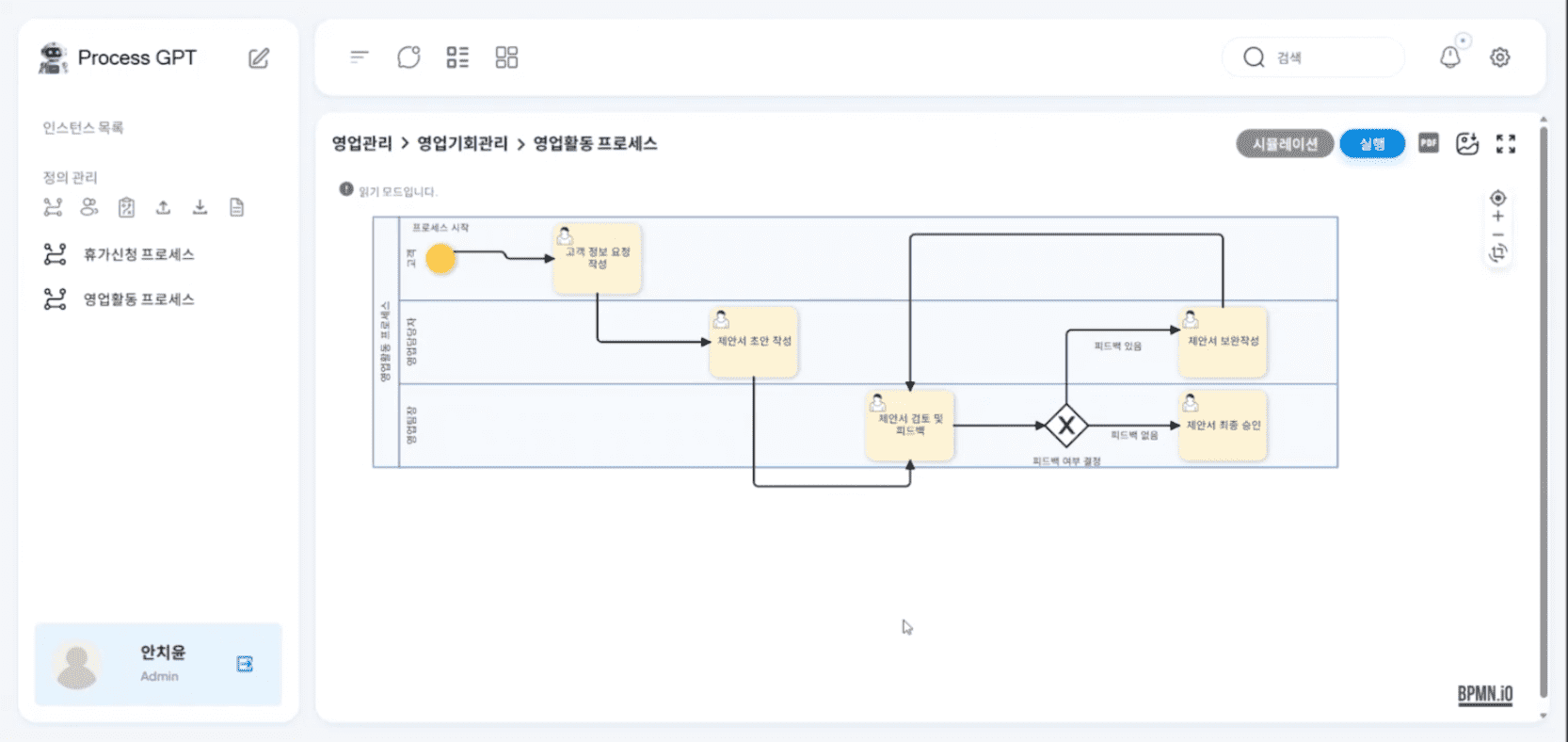 프로세스 정의 체계도에 등록된 프로세스를 클릭한 후, 아래와 같은 화면에서 '실행'을 클릭합니다.