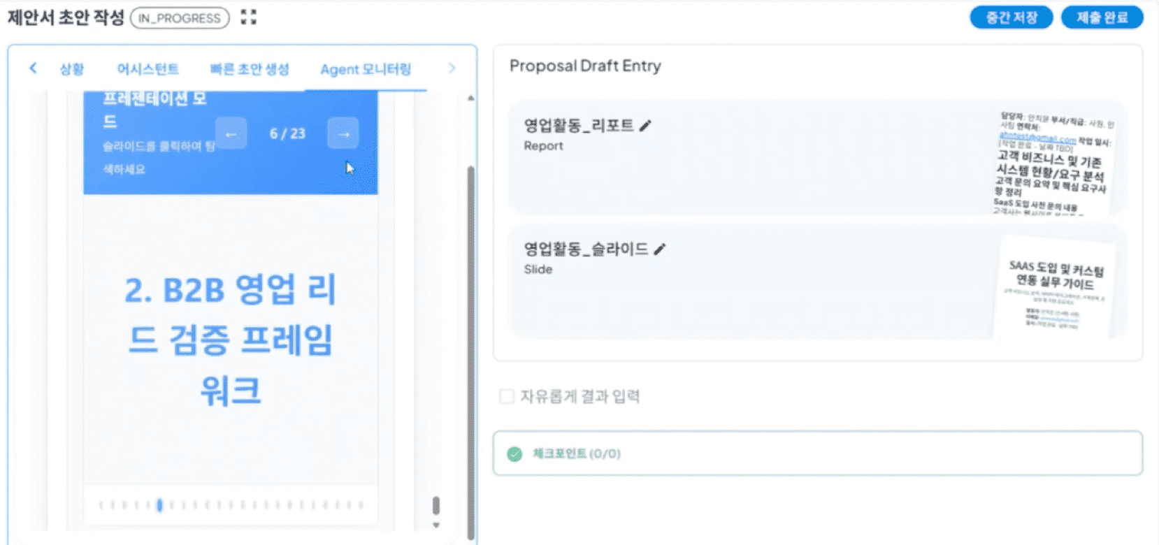 동일한 방식으로 아래와 같이 '영업활동_슬라이드'에 대하여 선택한 후, '제출완료'를 클릭하여 제안서 초안 작성 task를 마무리합니다.