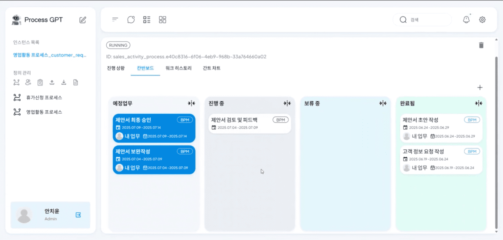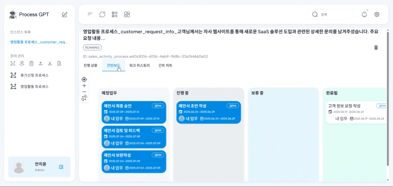 이후 '칸반보드'를 클릭하여 영업관리 프로세스의 전체 task중 진행 중인 task 제안서 초안 작성을 클릭합니다.
