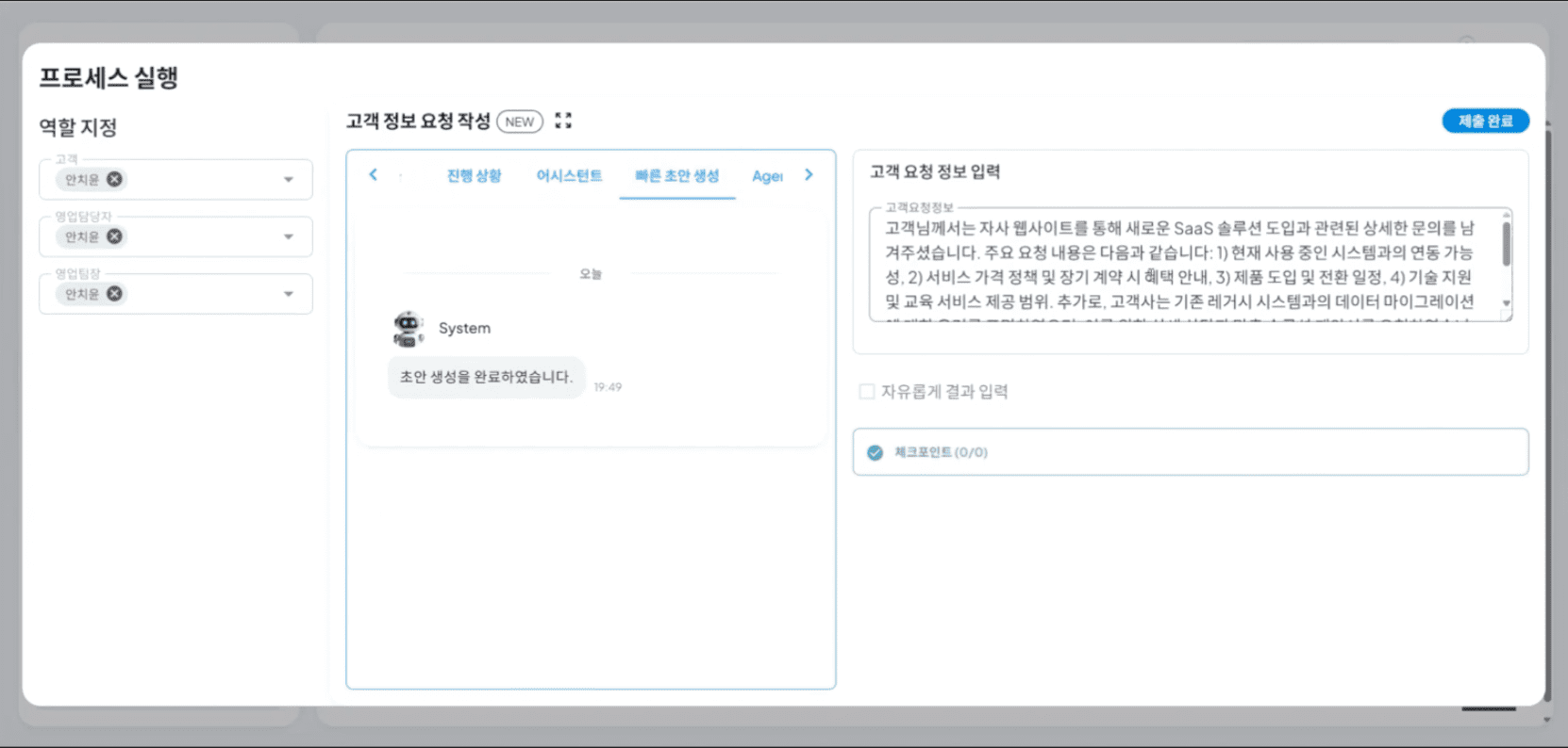 이후, 상단 항목에서 '빠른 초안 생성'을 클릭하여 고객 정보 요청 작성 task를 생성 후, '제출 완료'를 클릭합니다.