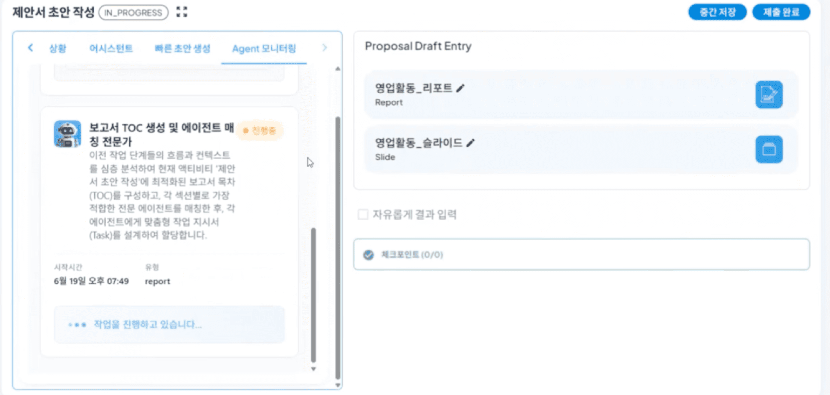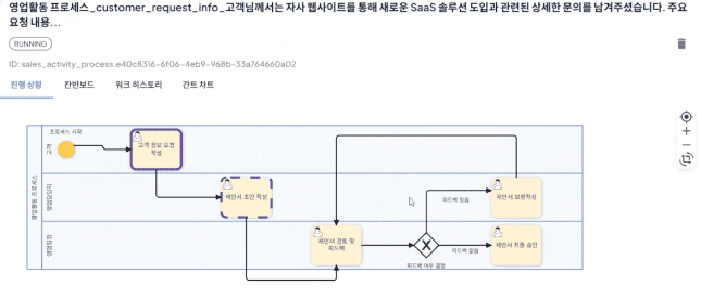 제안서 초안 작성 task 에서 Agent 모니터링을 클릭하면 영업관리 프로세스의 요구사항에 따른 전문화된 AI 에이전트들이 각자 필요한 제안서 초안 작성을 시작합니다.