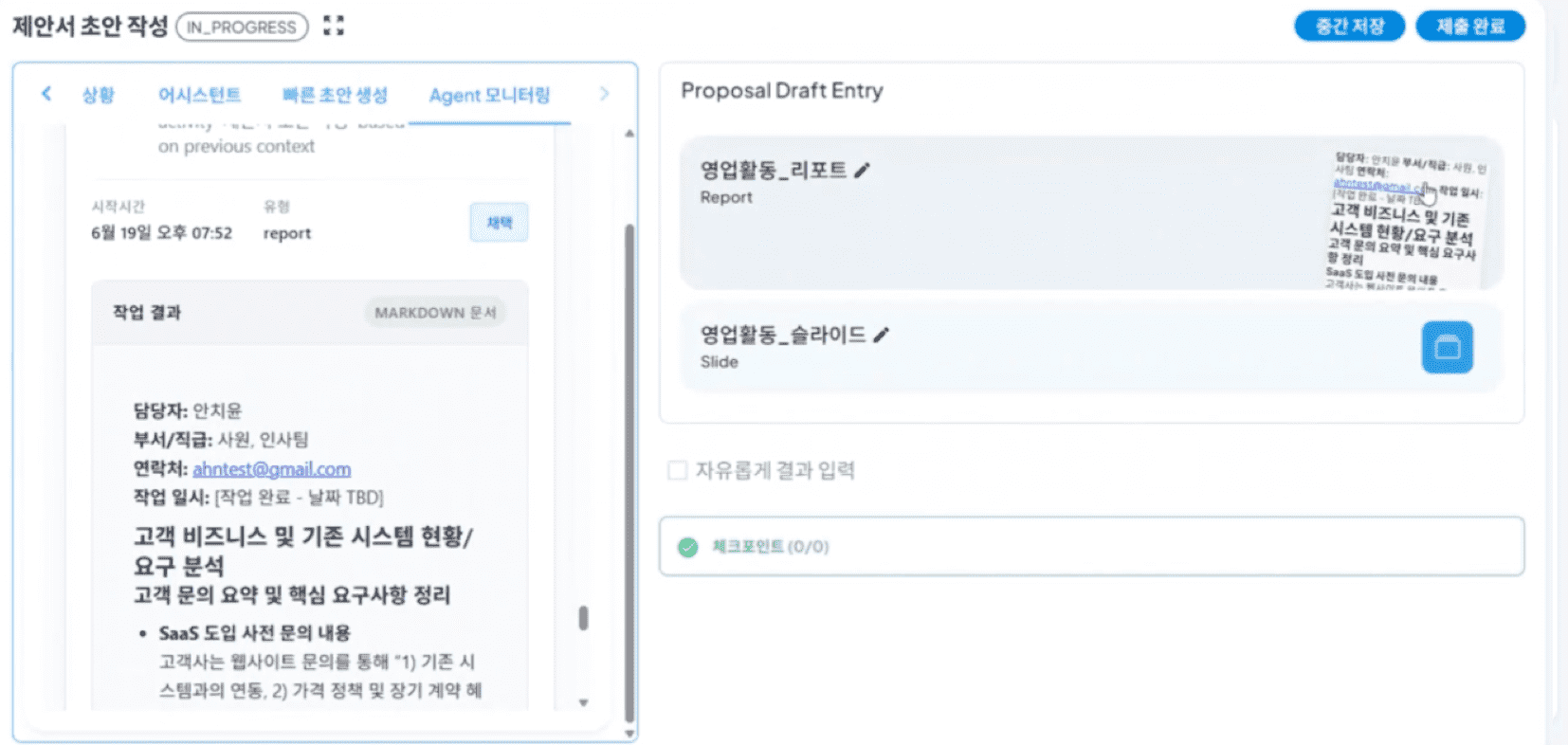 이후, 다시 진행 상황을 확인하면 진행 중이던 제안서 초안 작성 task가 AI 에이전트가 생성해준 제안서를 기반으로 완료된 것을 확인할 수 있습니다.
