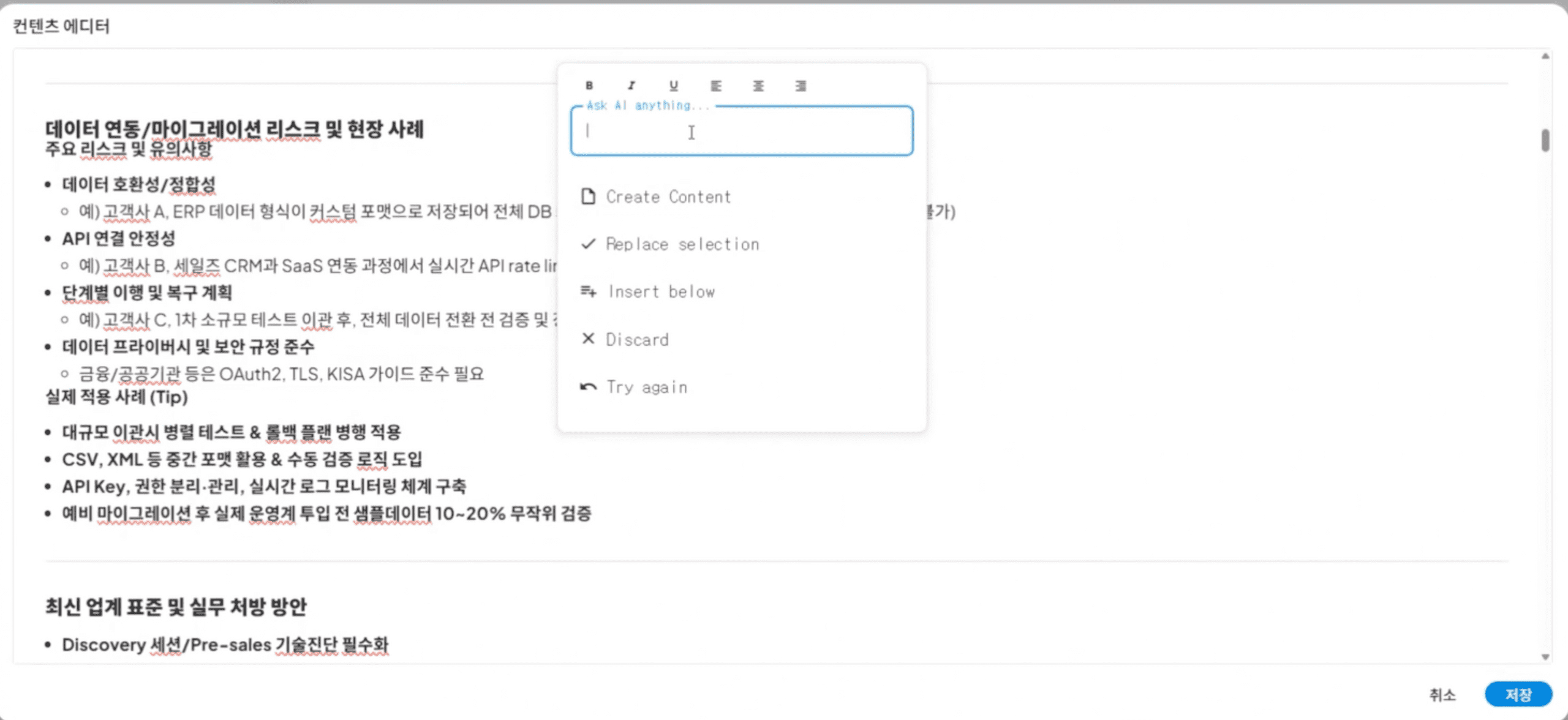 특정 내용에 대하여 Drag를 진행하면 아래와 같이 Drag한 영역에 대하여 요구사항을 입력하고 생성 및 수정을 진행할 수 있습니다.